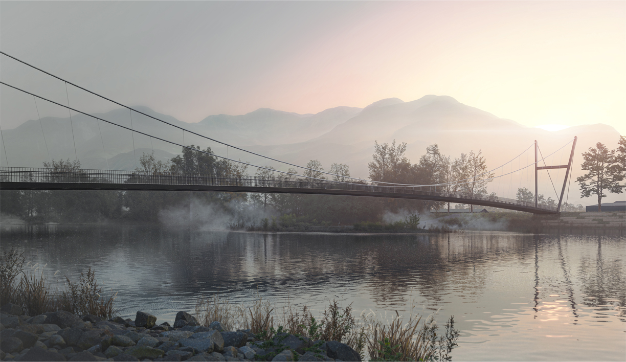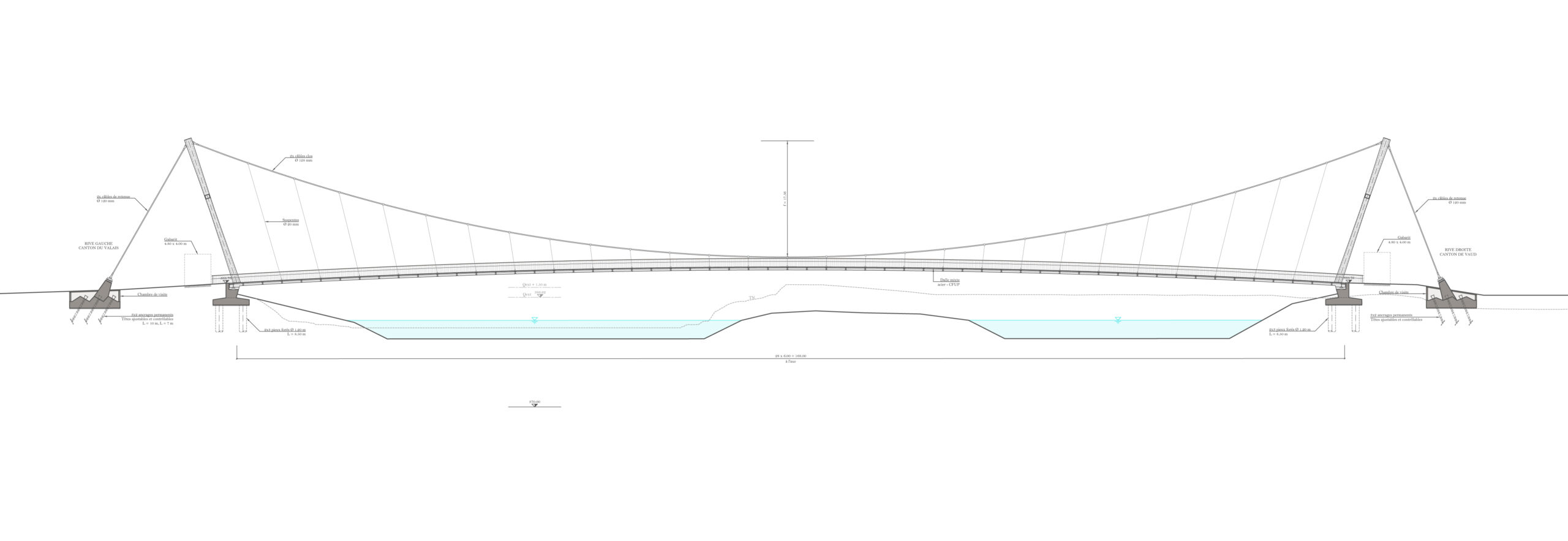 Im Rahmen des Wettbewerbs für den Fussgängersteg Illarsaz hinterfragte das Ingenieurbüro INGPHI die Relevanz der Erstellung und Zugänglichkeit einer dauerhaften Insel. Anstatt dem Rhein eine Insel aufzuzwingen, schlug es einen Hänge-Steg vor, der den Fluss ohne Zwischenstützen überspannt und zwischen den beiden Widerlagern verankert ist (3. Rang, 2. Auszeichnung).