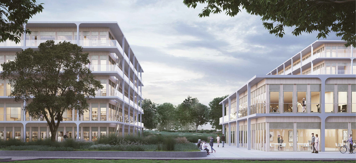 The new educational hub “Goutte de St-Mathieu” in Bernex consists of four buildings and an underground car park. The complex includes the Social and Health Training Centre, the Secondary School, and two multipurpose sports halls. A covered trench is planned to provide vehicle access to the logistics hub and parking area, as well as a covered pedestrian passage connecting the logistics centre to the car park.