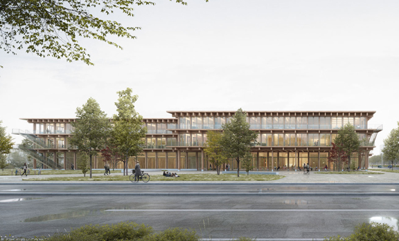 The structural design follows a reuse and recycling approach to reduce environmental impact. Timber recovered from the demolition of existing buildings is reused in the new timber structures, while crushed demolition concrete is recycled for use in the new reinforced concrete elements.